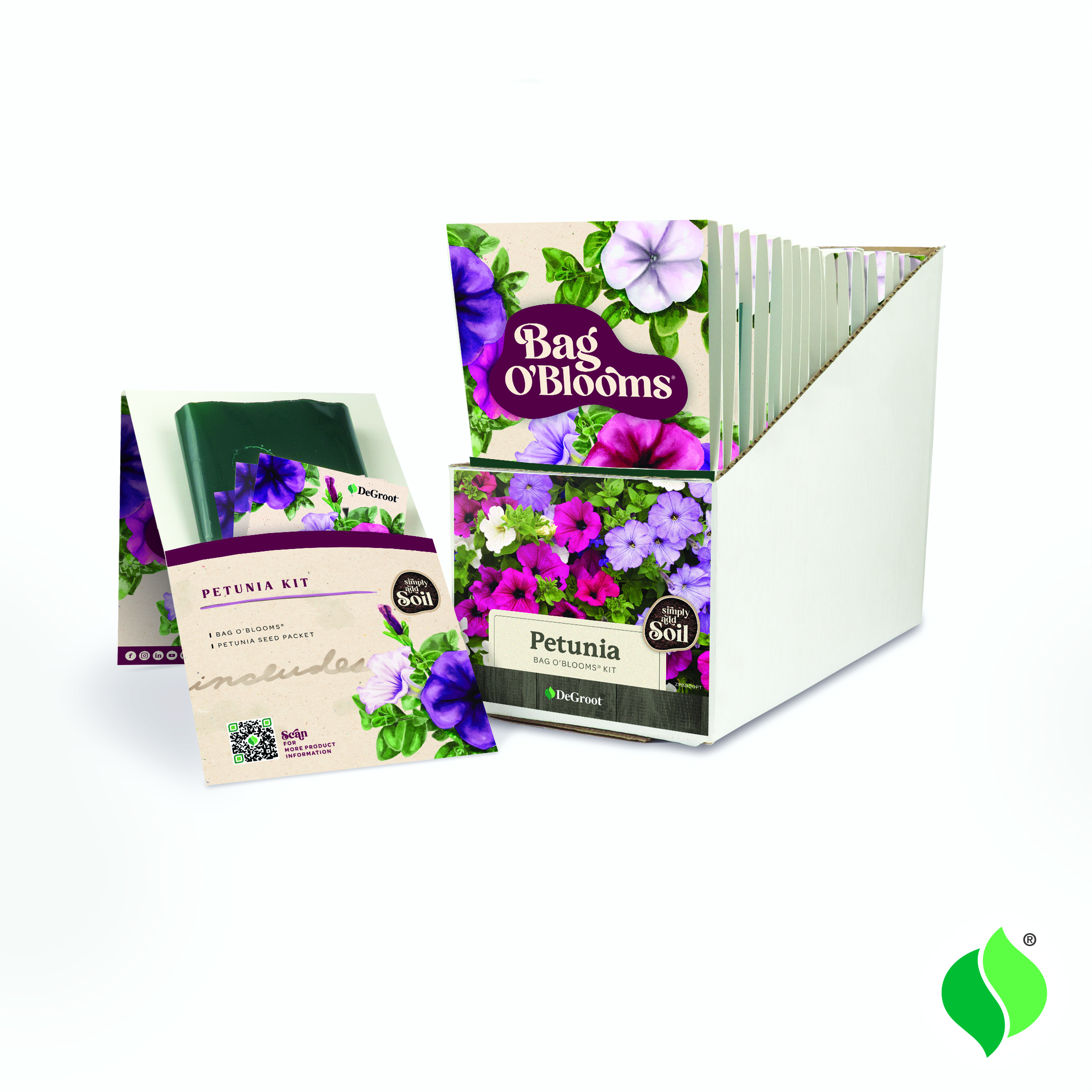 Bag O’Blooms® Petunias are the perfect choice for adding vibrant color to any garden space! These versatile blooms can be easily hung on the deck, near the patio, on a fence post, or integrated into the landscape, offering endless possibilities for decorating your outdoor areas. With their charming blossoms and extended flowering period, petunias have rightfully secured their place as one of the most beloved garden flowers. This kit provides the ultimate flexibility in growing, allowing for easy maintenance and care. Simply hang them, water regularly, and marvel as they flourish and bloom into a gorgeous display of color and vitality! Whether you’re a gardening enthusiast or a beginner, Bag O’Blooms® Petunias are a delightful and low-maintenance addition to any outdoor space, bringing joy and beauty to your surroundings. Each case pack includes 20 kits and an eye-catching POP bin.