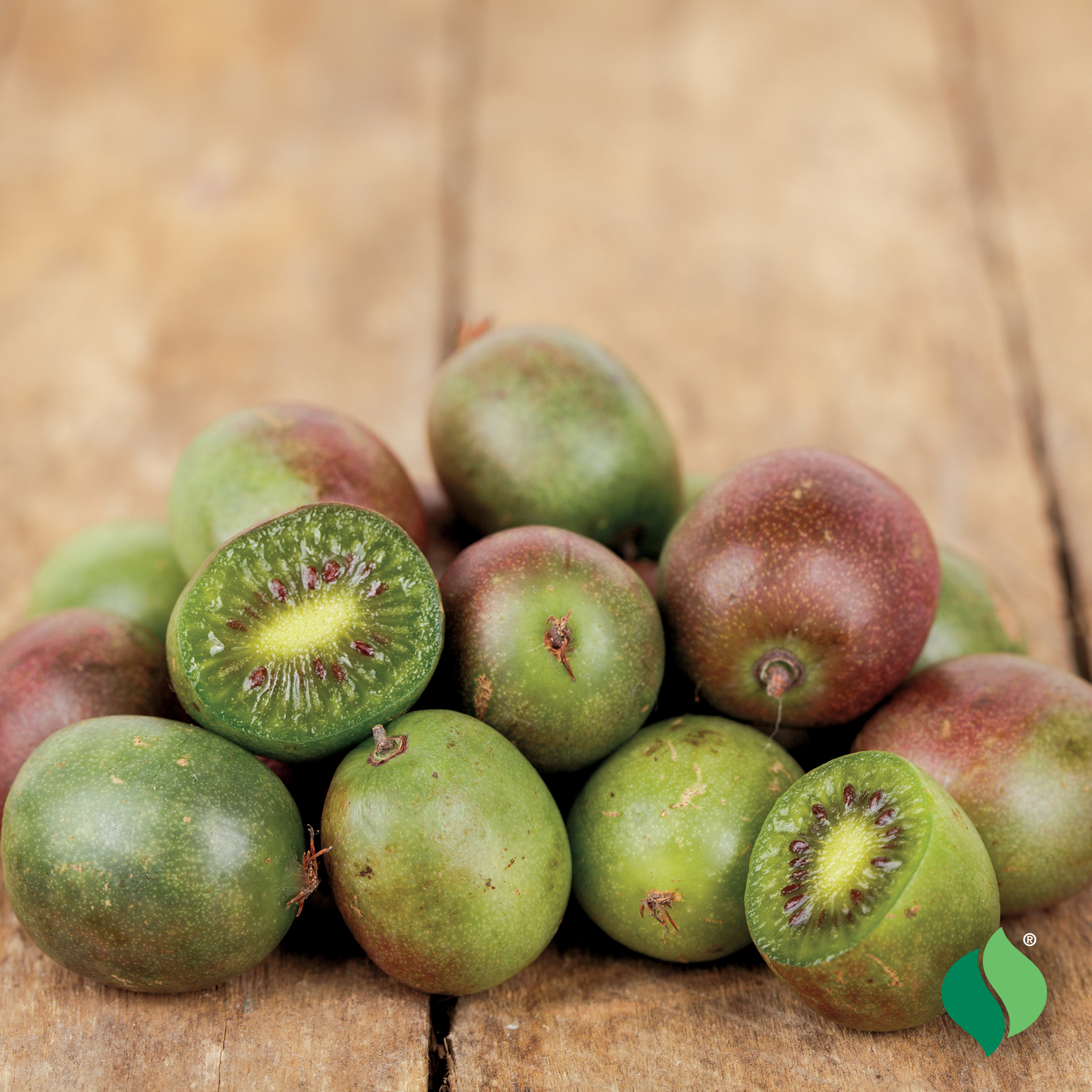 ‘Prolific’ Kiwi, is a self-pollinating variety that is early ripening and produces abundant crops of medium to large, sweet and tasty fruit. The cultivar is sometimes used as a pollinator for other female cultivars. Fruits are flavorful with reddish/violet on the skin and flesh when ripe. Minimum chilling requirements; 300 hours. These Kiwi have smooth-skinned fruits so there is no need to peel the skin of the fruits unlike the fuzzy fruit species Actinidia deliciosa. Fruits vary in size and are similar to several varieties of grapes. Plant stems and fruit buds are more cold tolerant than the A. deliciosa species and are mainly grown in colder areas where the cold temperatures can range from 10ºF to -18ºF. Fruit flavors are of course different with every cultivar, similar to all fruits.