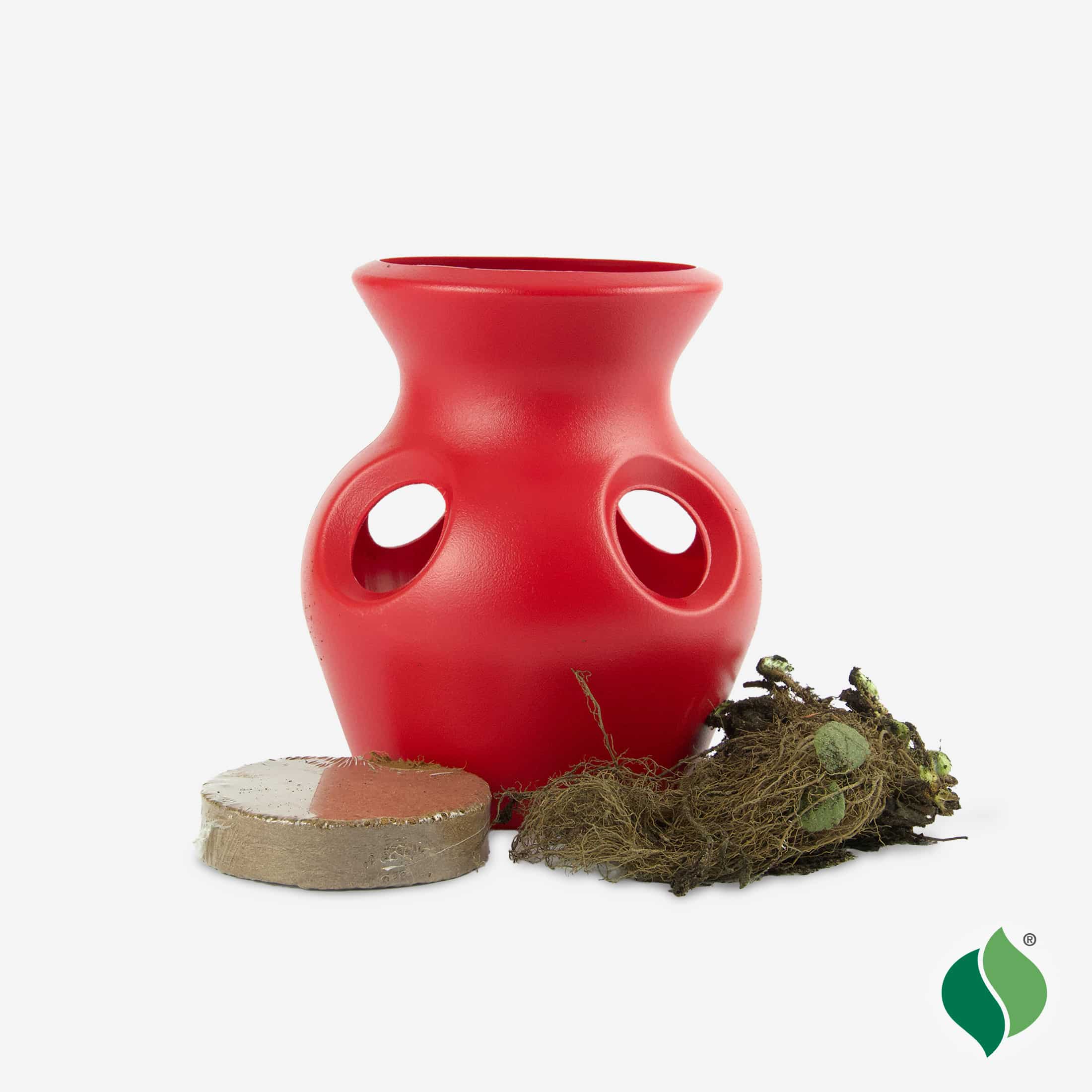 3. Firmly press one plant, roots first into each opening on the sides of the pot. Insert the plants so that the entire root system is covered with media, while leaving the top of the plant sticking out of the hole. Two to three plants may be inserted into the top of the pot.
